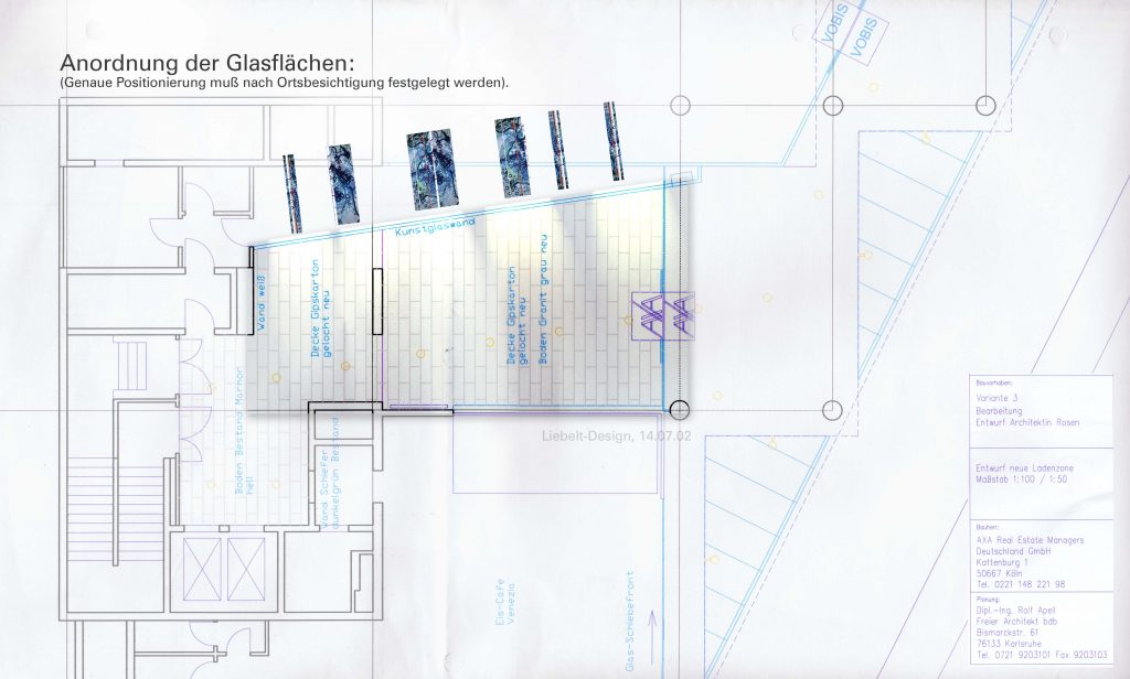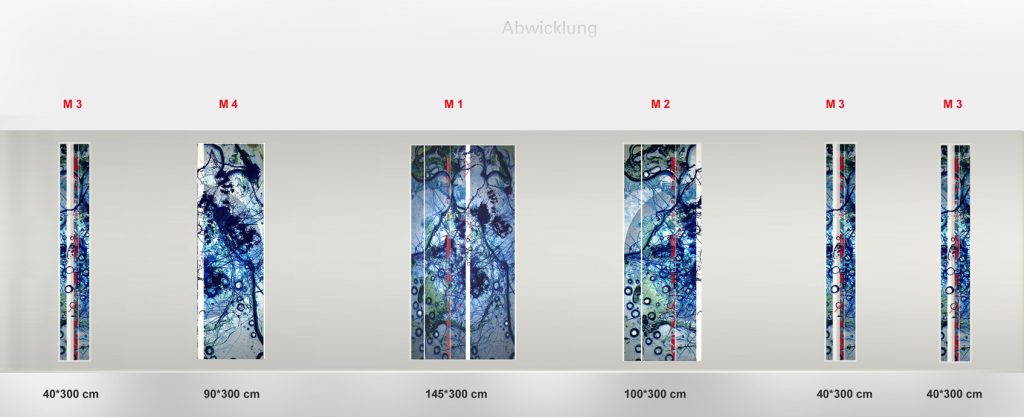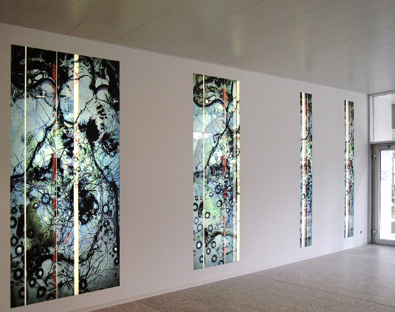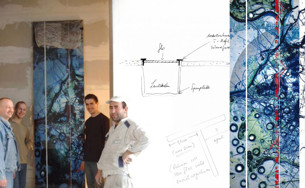 - Technik: co-co-painting im Glas. Entwickelt wurde eine Glaskunst, deren Glasflächen bündig zur Wand eingesetzt wurden (ca. 15m).