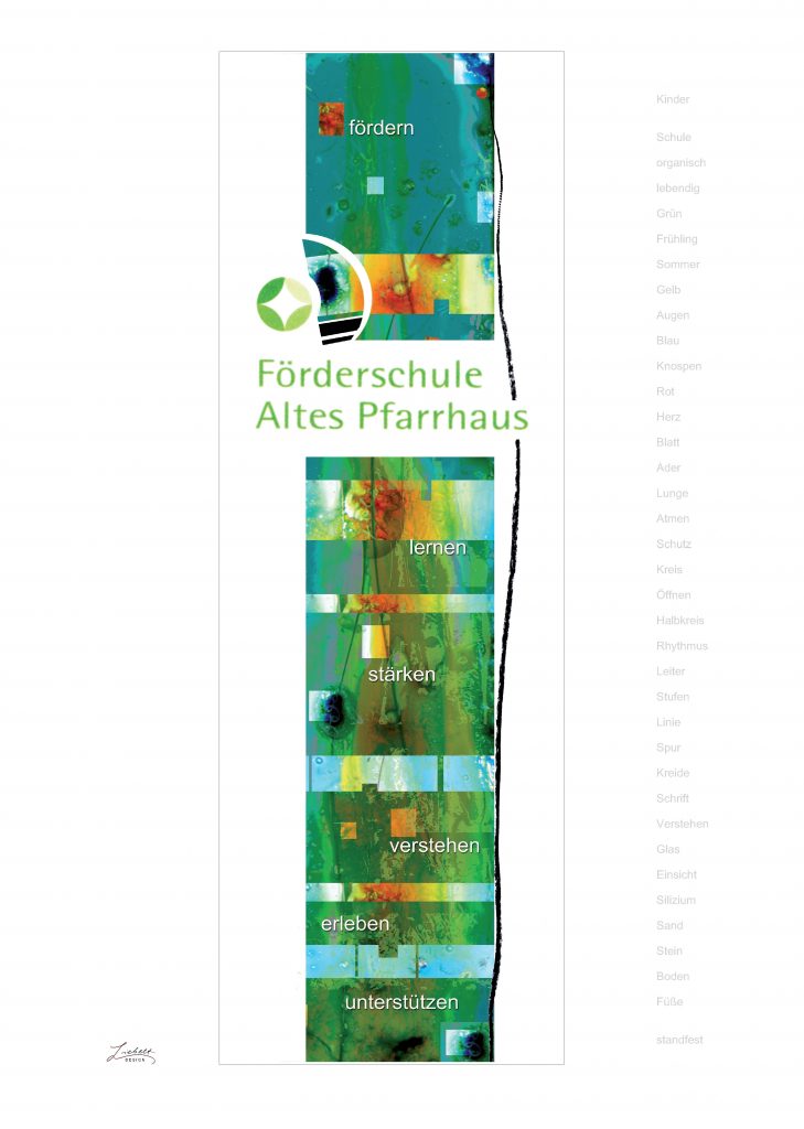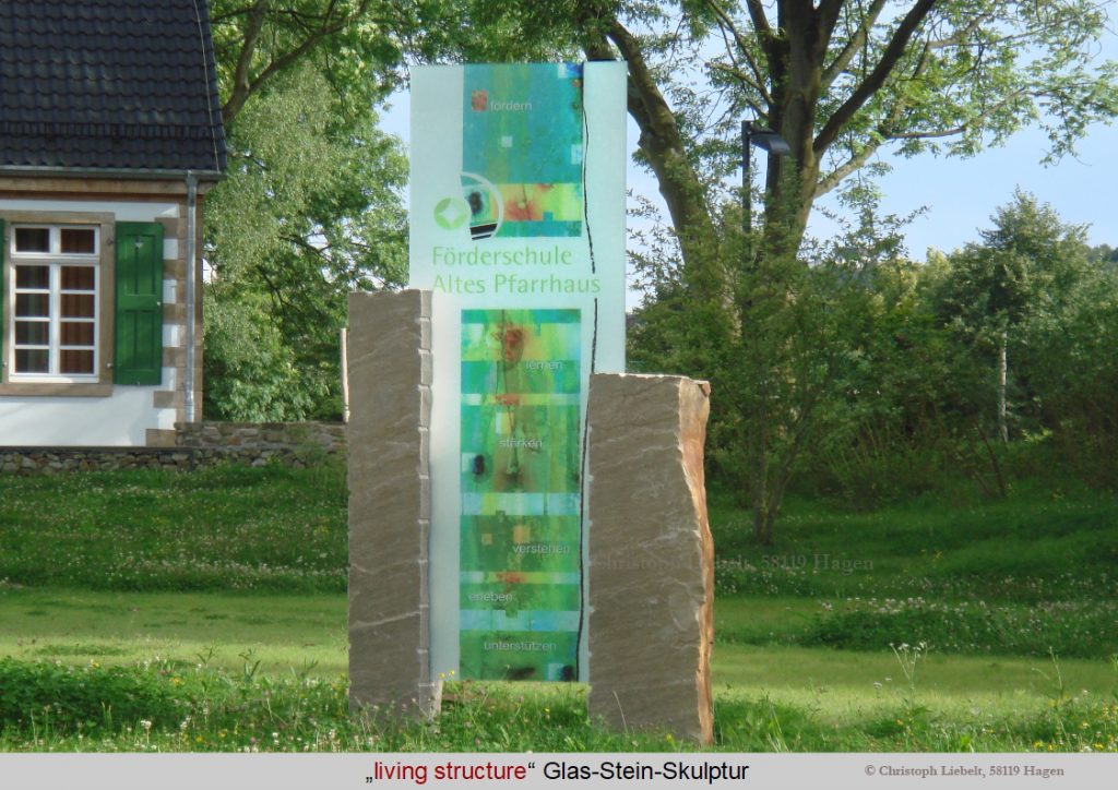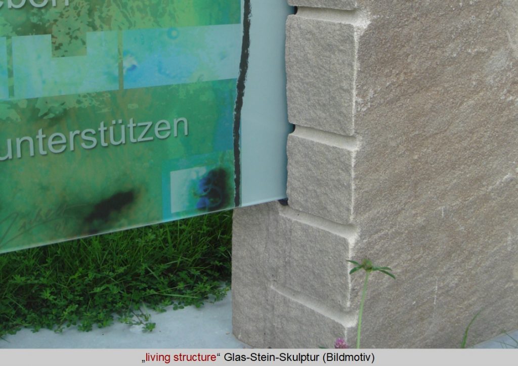 • Technik: co-co-painting im Glas. Glasstele in Kombination mit Herdecker Natursandstein.